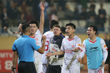 Các cầu thủ Thể Công Viettel chạy ăn mừng nhưng sau đó trọng tài lại không công nhận bàn thắng ở loạt luân lưu với CAHN tại vòng 1/8 Cúp Quốc gia 2025/26.